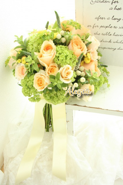 バラ(オークランド)、スプレーバラ(サラ)、ビバーナム、ヒペリカム、マトリカリア(イエローべグモ)、ヴェロニカ、ブプレ